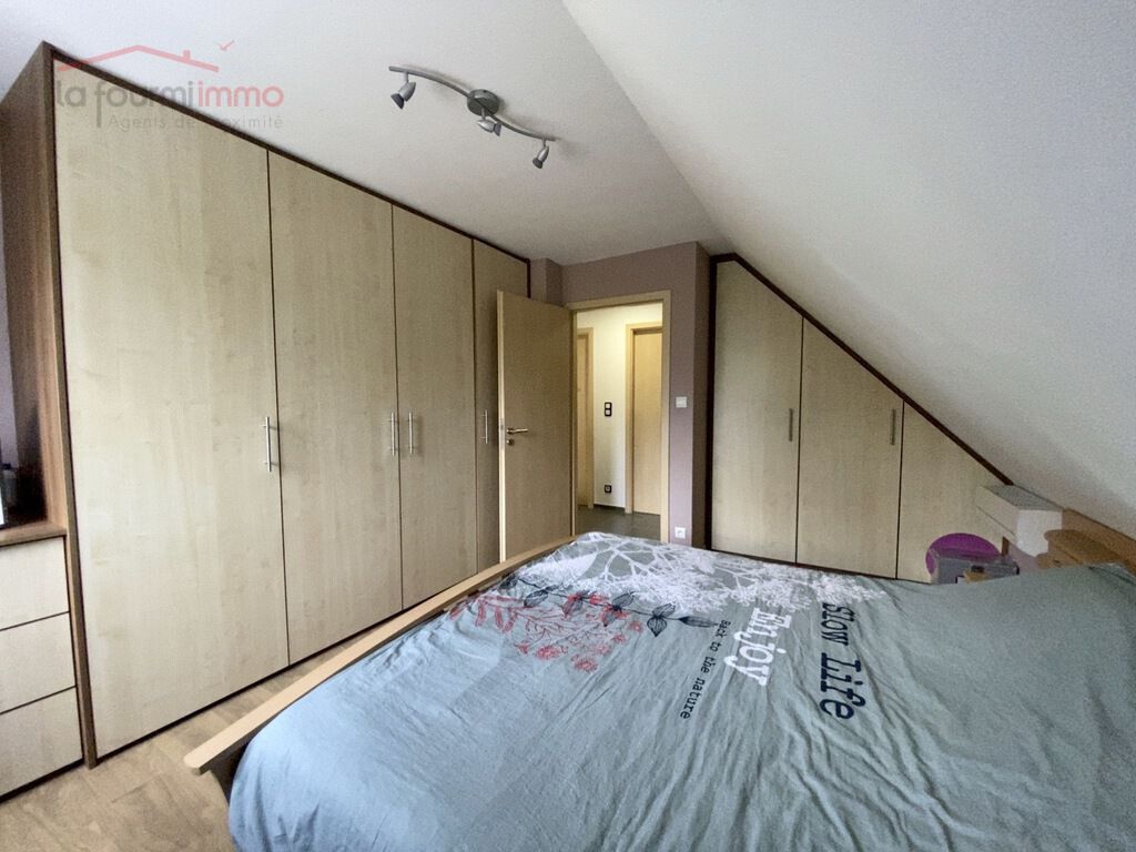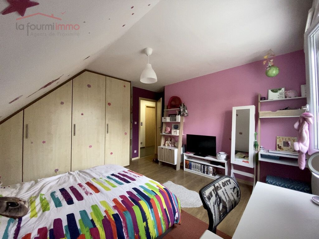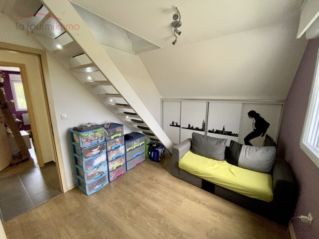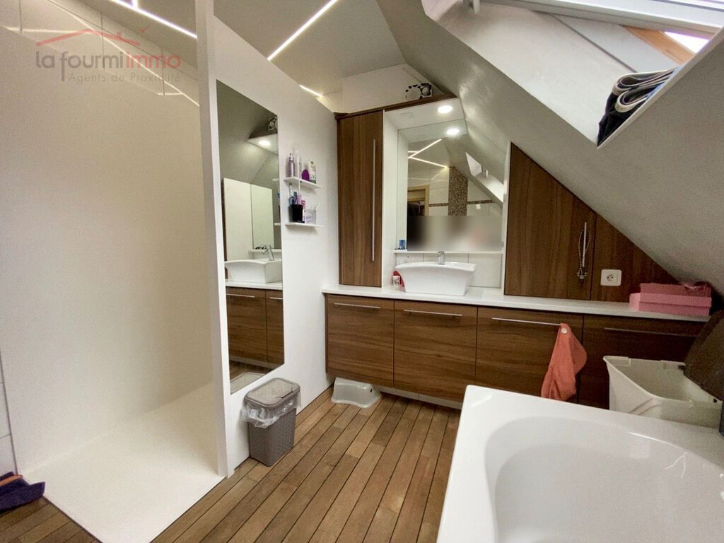 À l'étage, le couloir vous donne accès à la salle de bain avec WC, une chambre parentale climatisée d'environ 11m², une chambre d'enfant d'environ 11m² ainsi qu'un bureau. Une troisième chambre chambre à été aménagé sous les combles.