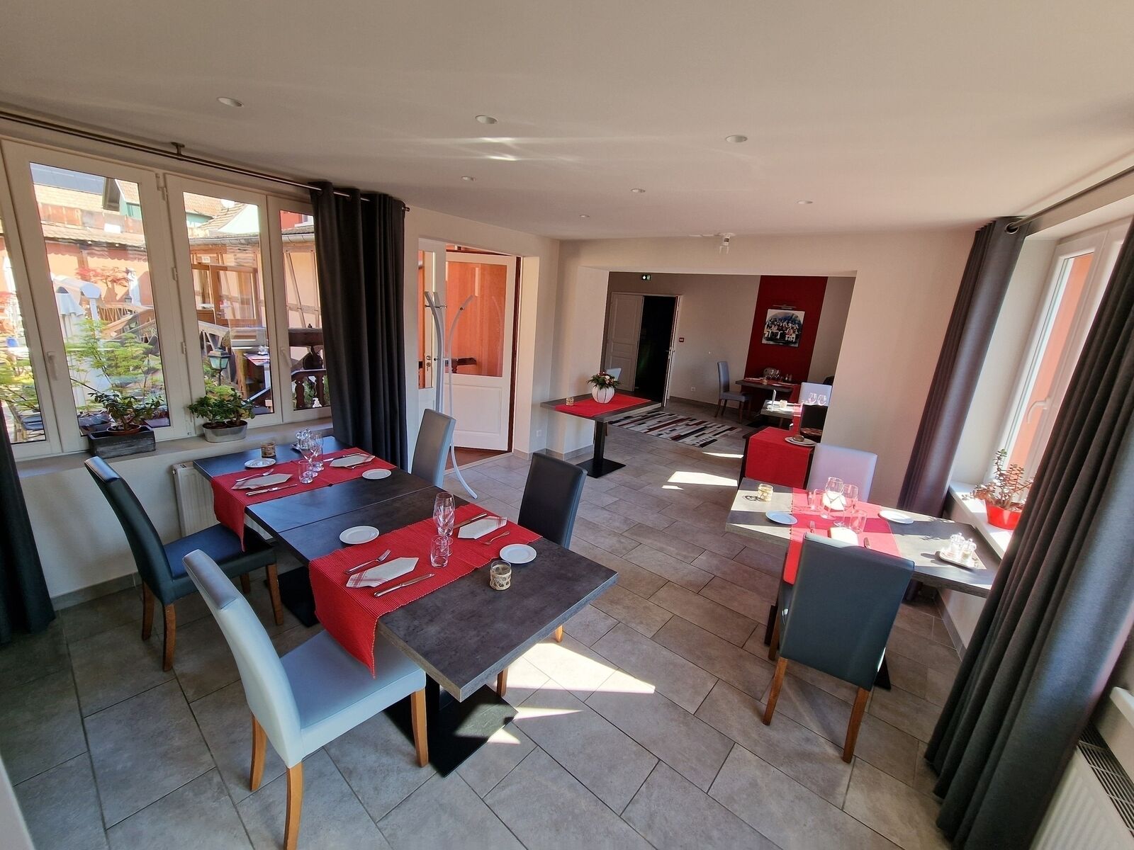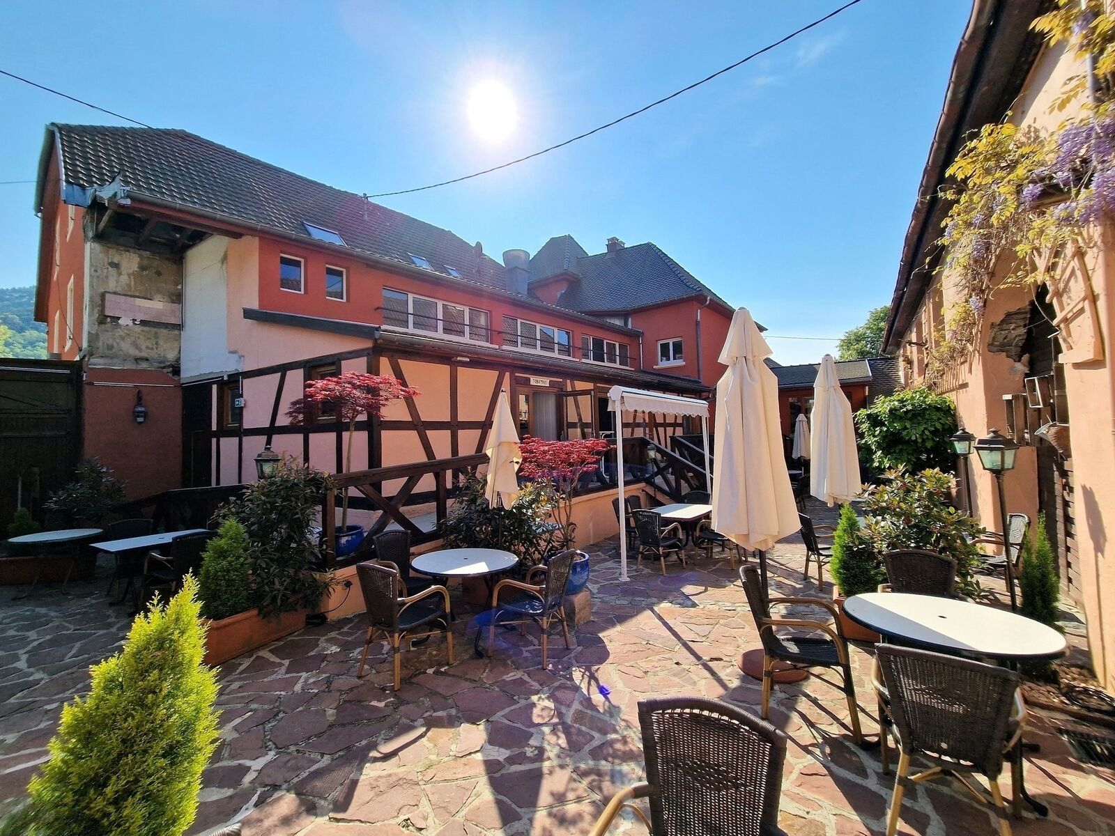 Aménagement : hall d’accueil, trois salles de restauration, cuisine, grenier, buanderie, caveau, terrasse agréable et cour.