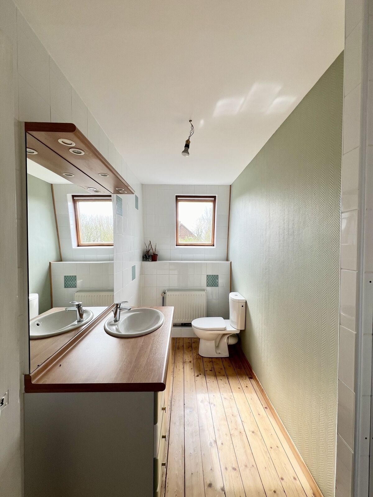 À l'extérieur, une magnifique terrasse vous invite à profiter de l'environnement paisible qui entoure la maison. Deux garages et un vaste atelier de 60 m² complètent cet ensemble, offrant des espaces de rangement et de travail appréciables.