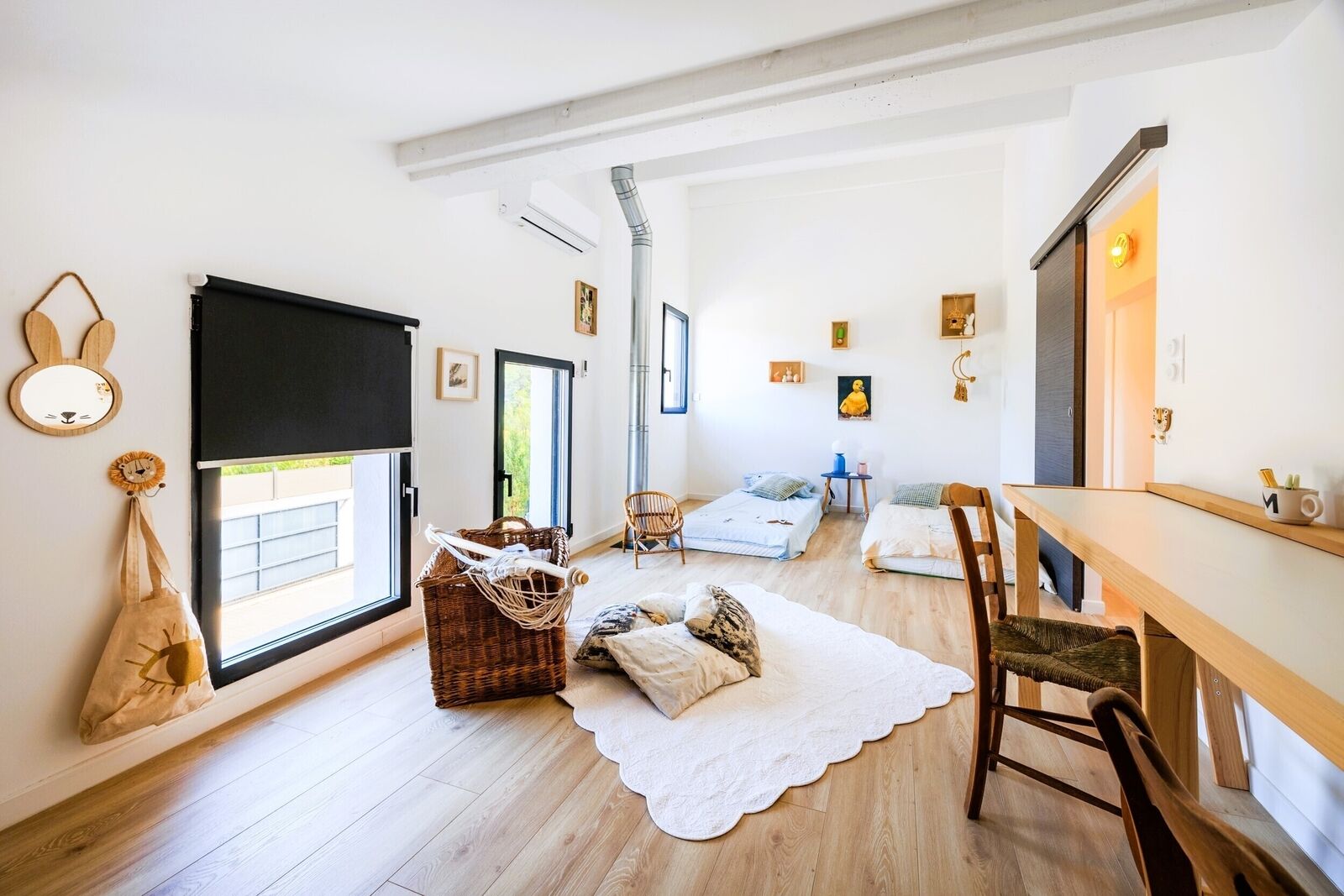Climatisation réversible dans toutes les pièces. Poêle à granulés dans la pièce de vie également. Nombreux espaces rangements et placards.