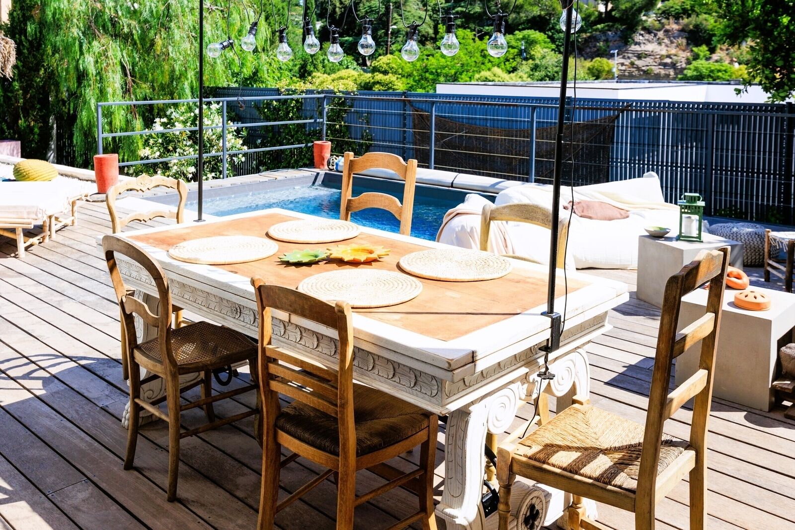 L’entrée de la maison s’ouvre sur une belle pièce de vie lumineuse, grâce aux nombreuses baies vitrées qui permettent un accès à plusieurs coins terrasses différents et aménagés, et qui conduisent vers l'espace piscine. La pièce de vie se prolonge vers une cuisine totalement équipée, avec buanderie.