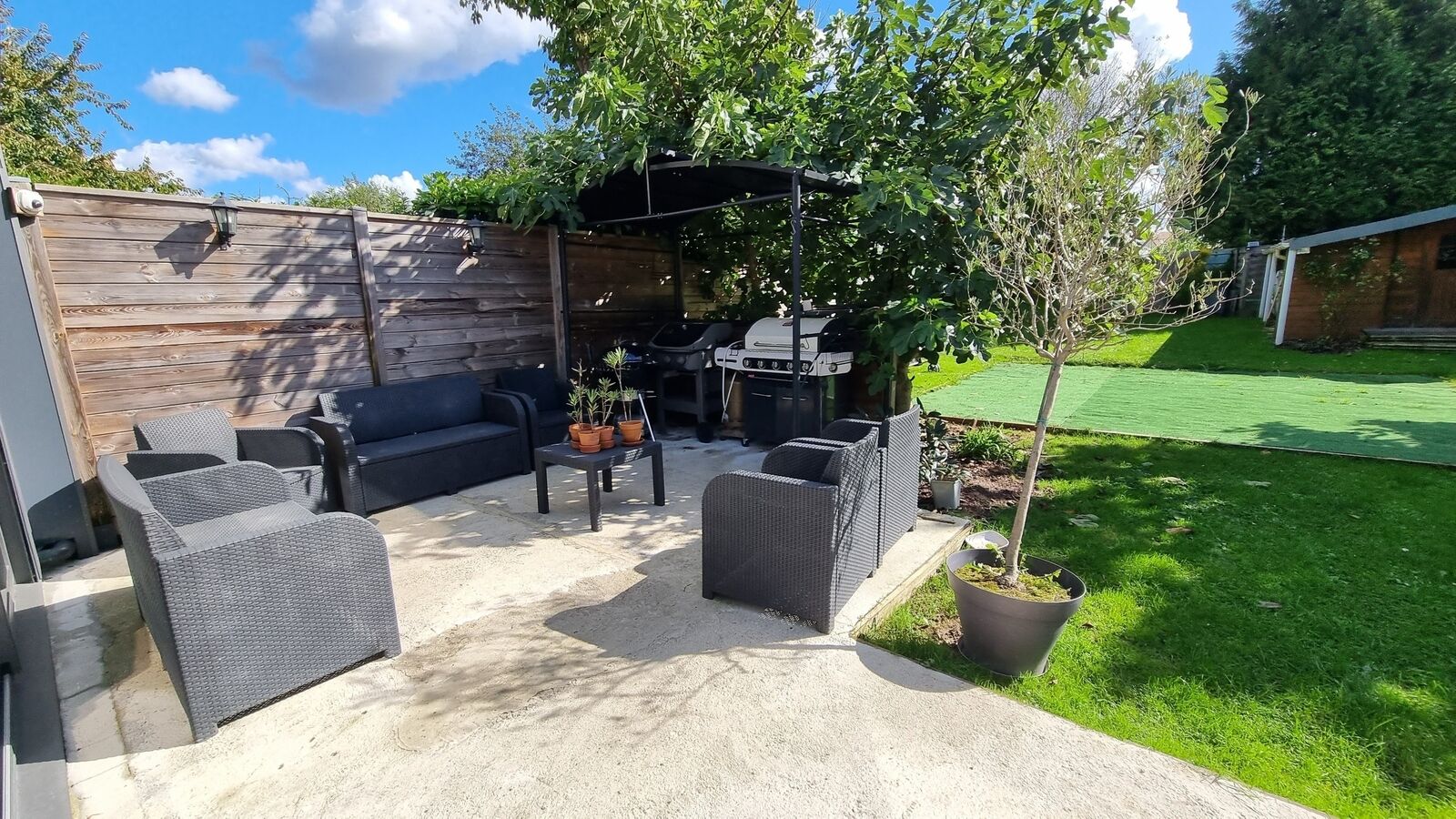 Un jardin sans vis-à-vis, une dépendance pour l'outillage de jardin, un coin barbecue .