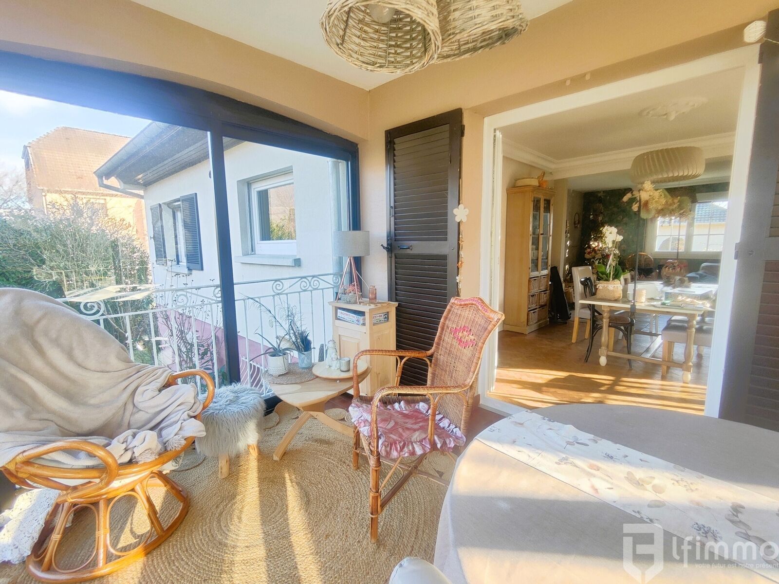 - Salon/salle à manger lumineux d’environ 31 m², donnant accès à une véranda d’environ 10 m² et à un balcon.