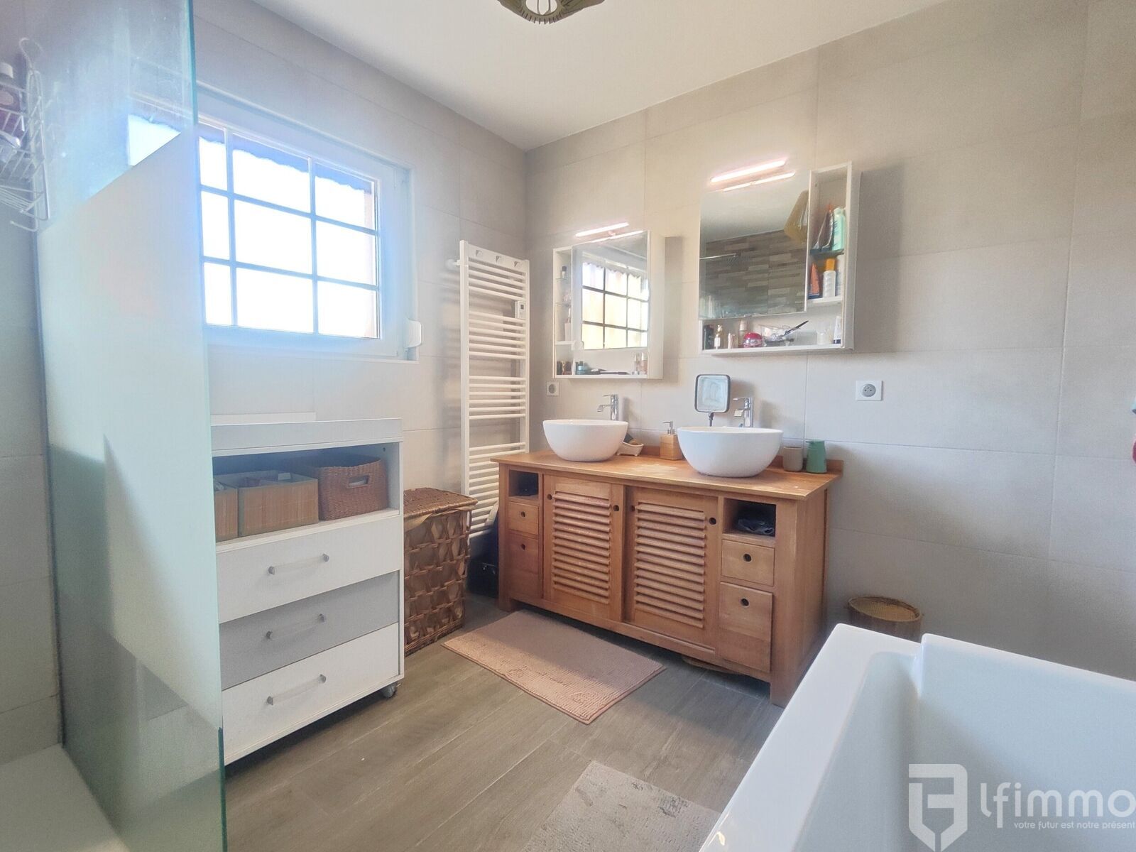 - Une salle de bain moderne avec double vasque, grande douche et baignoire.