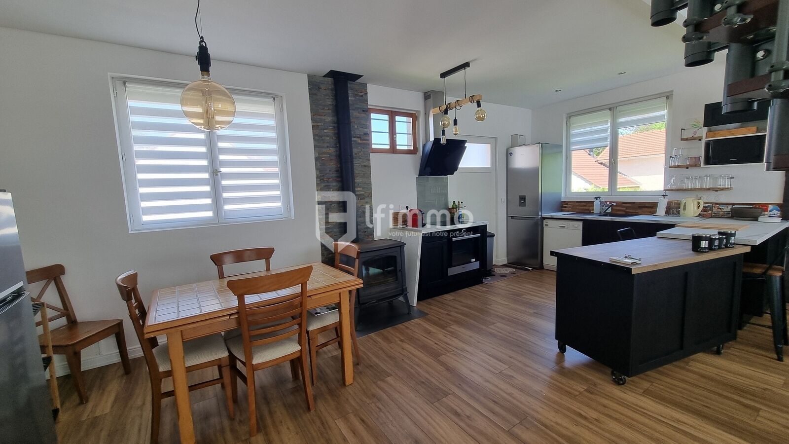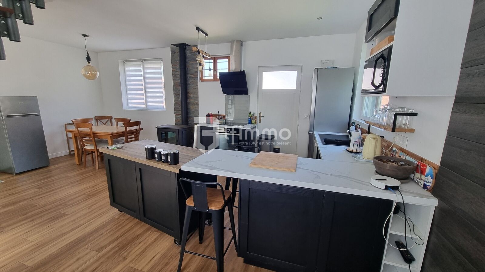 Au 1er niveau vous trouverez une jolie pièce à vivre avec poële à bois, une cuisine ouverte équipée , une mezzanine vous offrant un espace de stockage ou une chambre .