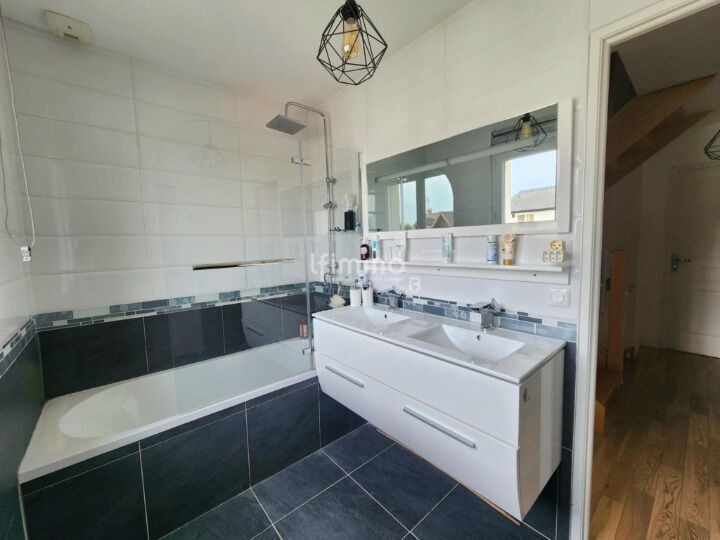 2e étage : trois chambres (entre 10,40 m² et 11,30 m²), une salle de bains avec double vasque et sèche serviettes, ainsi qu’un WC séparé.