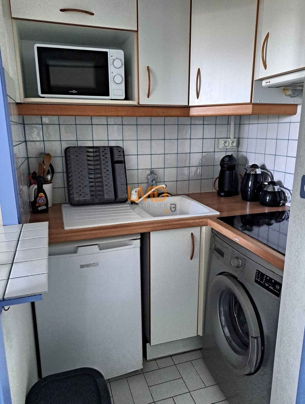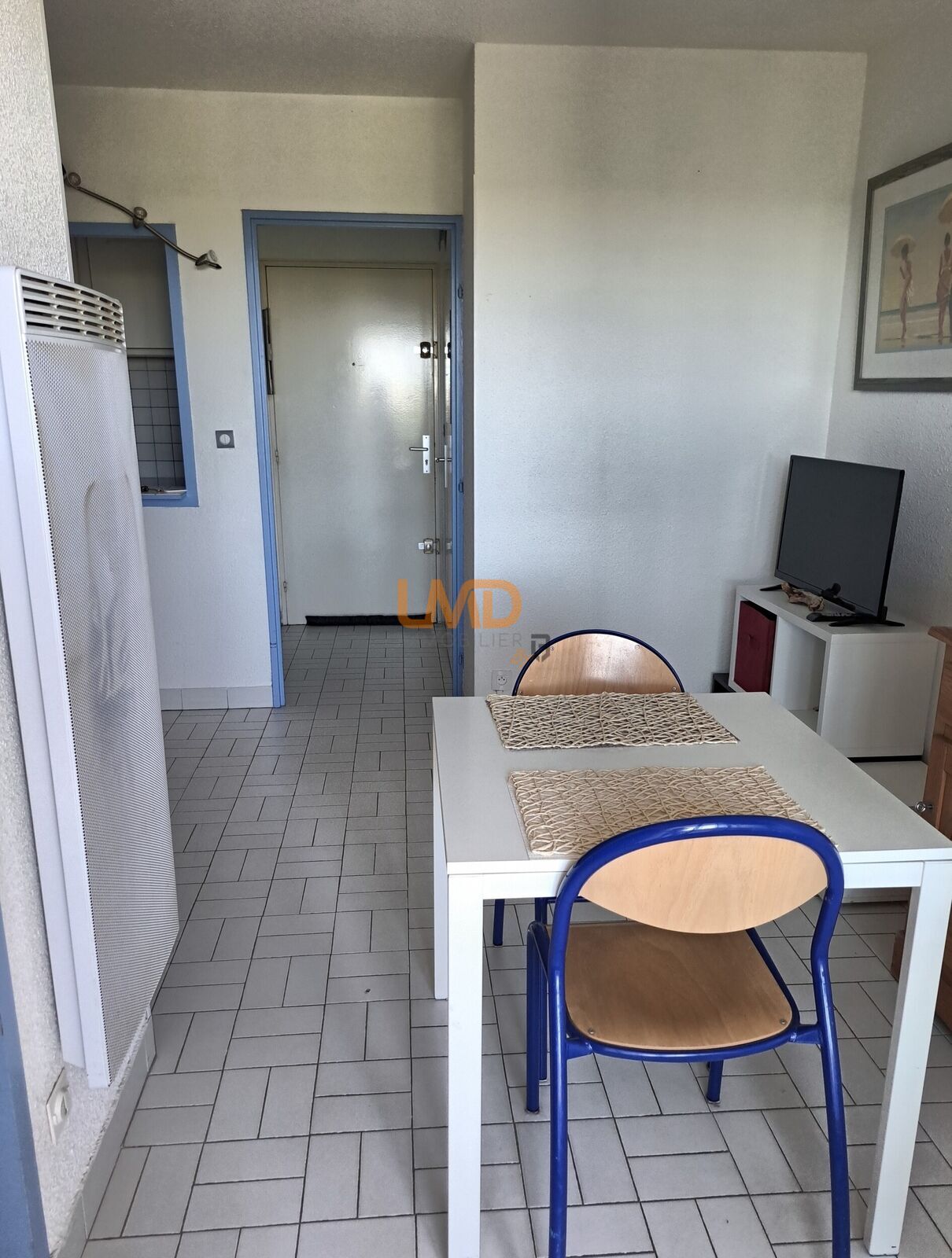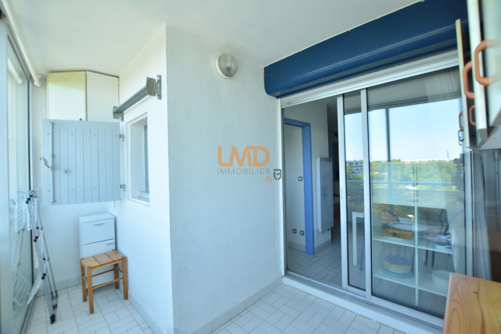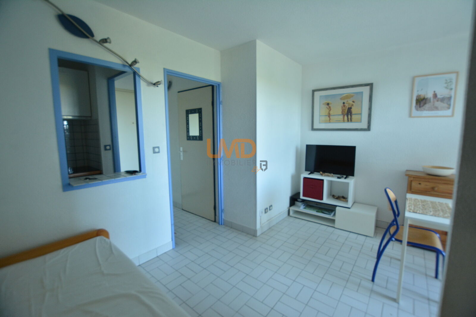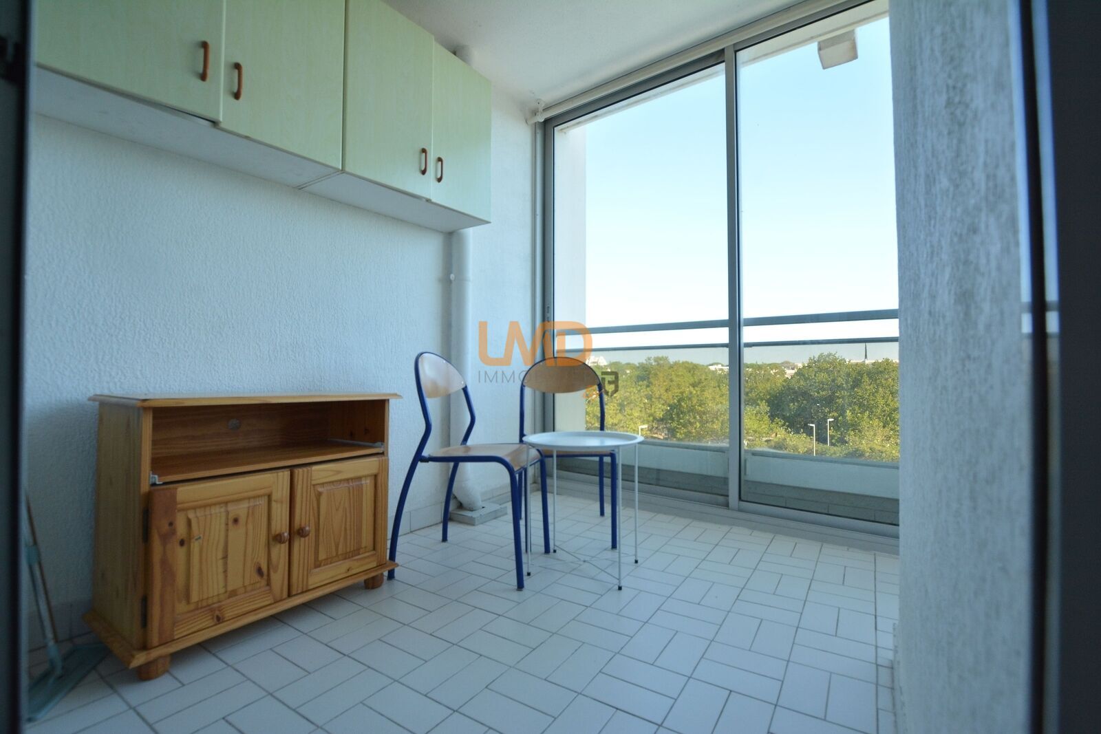 Disposé avec une kitchenette équipée, d'un salon avec grand placard de rangement, un espace chambre et d'une salle de bains avec toilette intégré et d'une loggia fermée avec rangement.