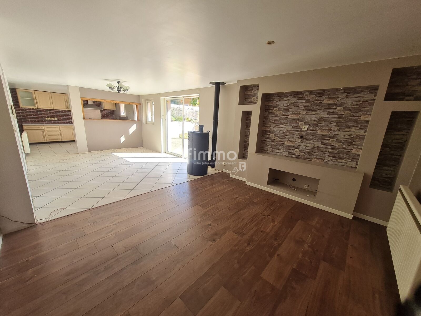 lumineuse avec cuisine aménagée et poêle à