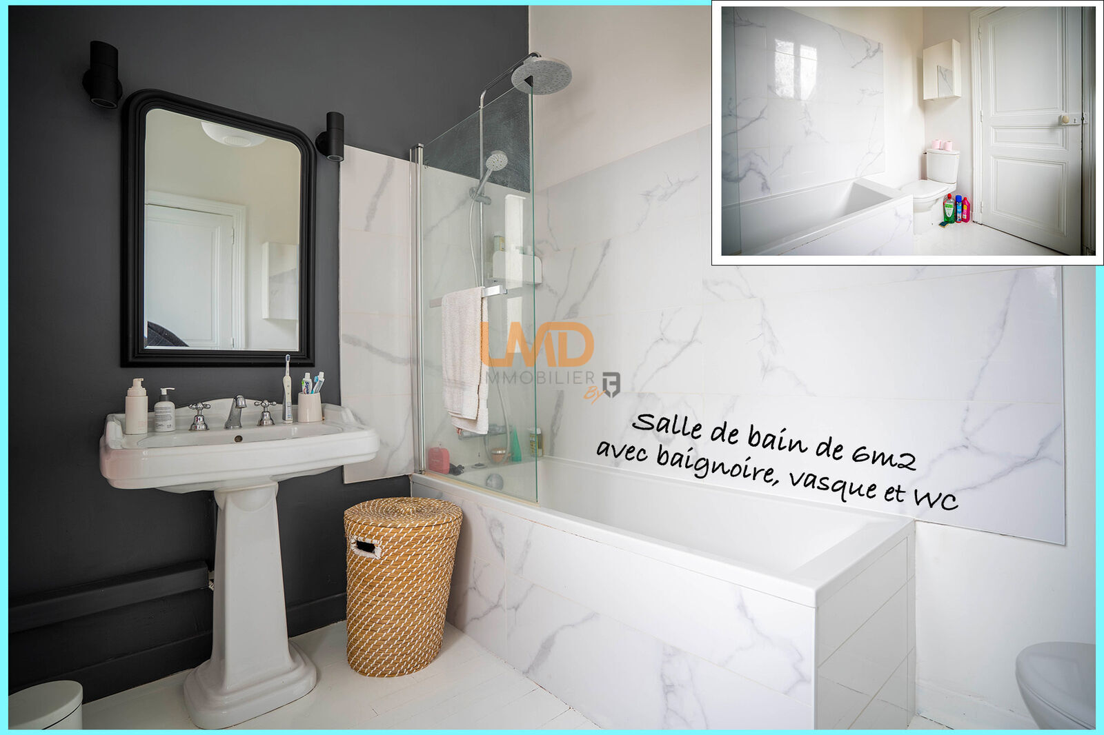 La salle de bain de 6m2 se compose d'une baignoire, d'une vasque, de rangements et d'un WC.