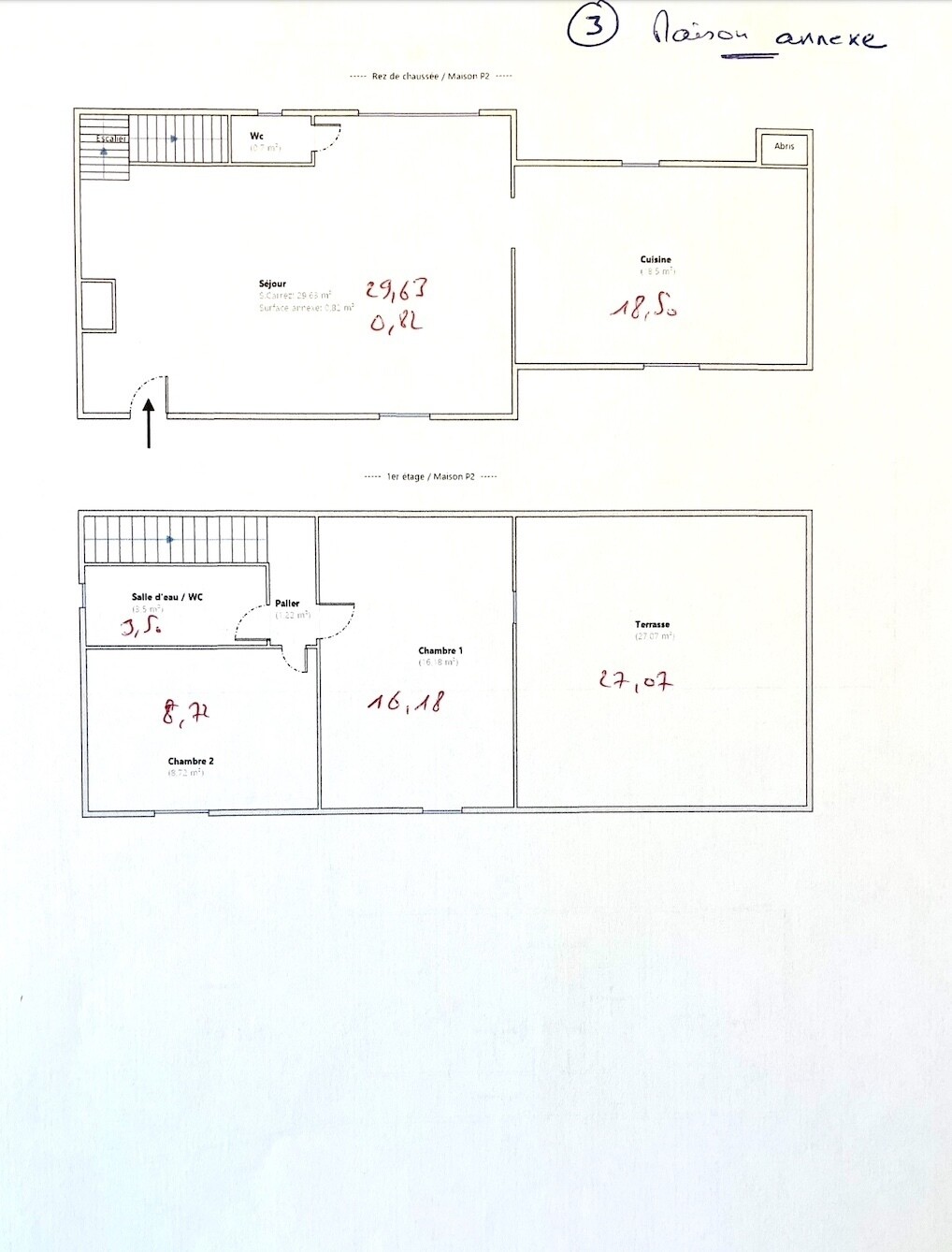 Maison annexe T3 – 78 m² : un séjour de 29 m², une cuisine équipée de 18 m², deux chambres (9 et 18 m²) dont une avec terrasse privée, salle d’eau, WC et une grande terrasse de 27 m² face au jardin.