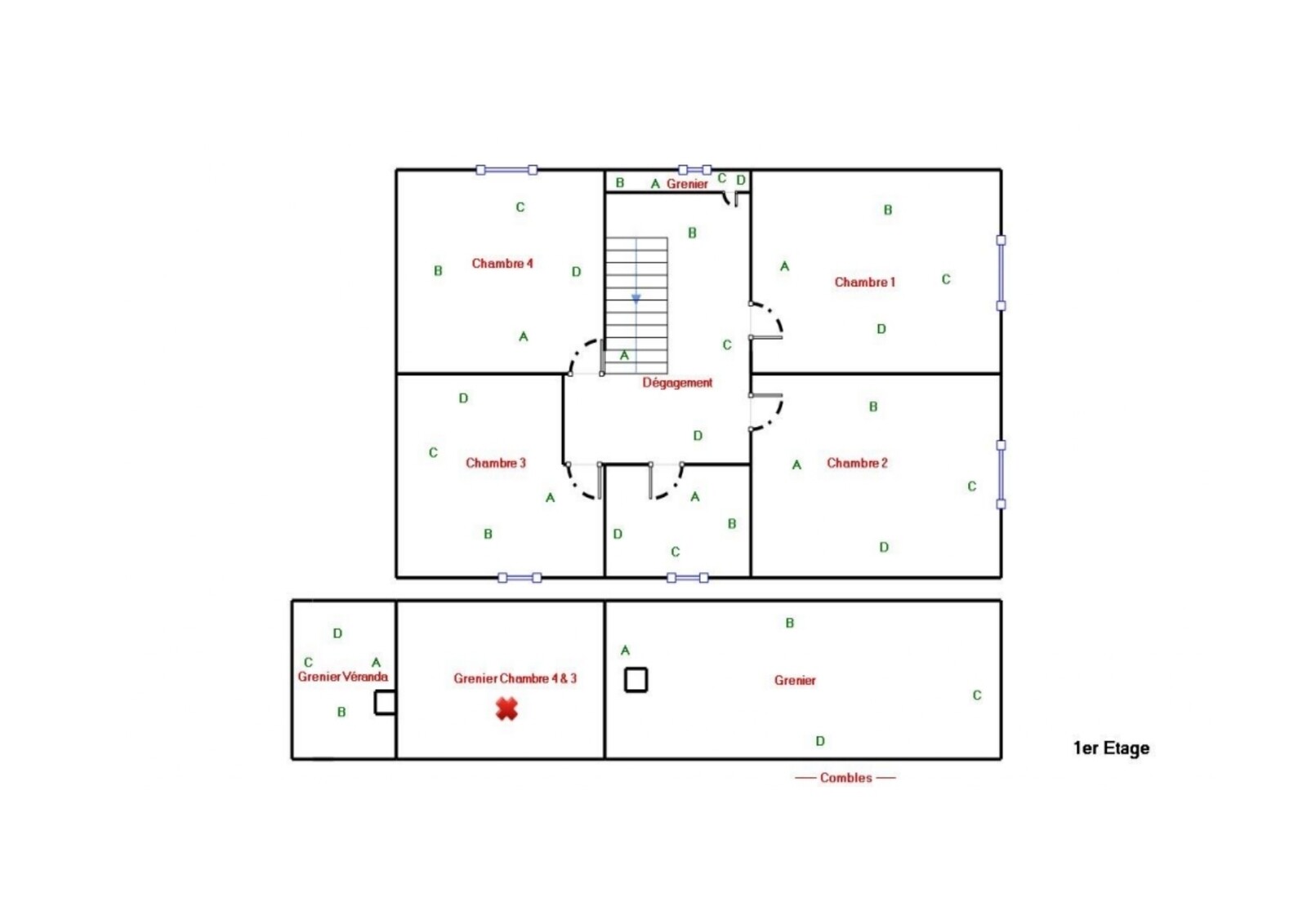 Étage : un couloir dessert quatre chambres de 10 à 15 m² et un WC séparé.