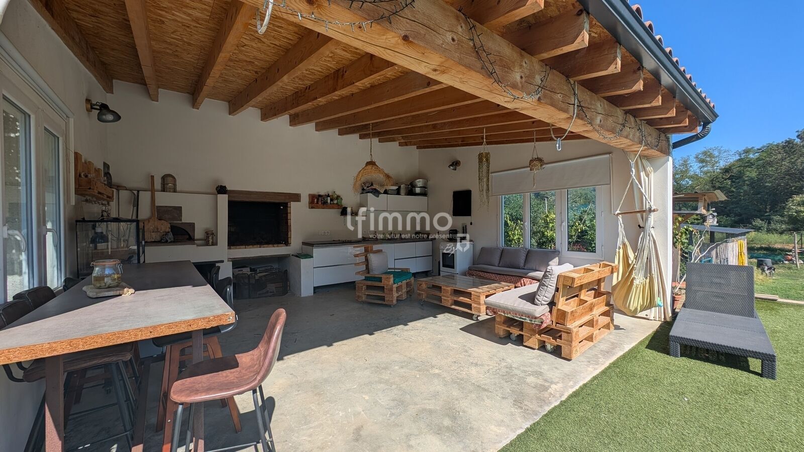Une magnifique cuisine d’été de 40 m², entièrement équipée, avec barbecue et four à pizza, idéale pour les journées ensoleillées,