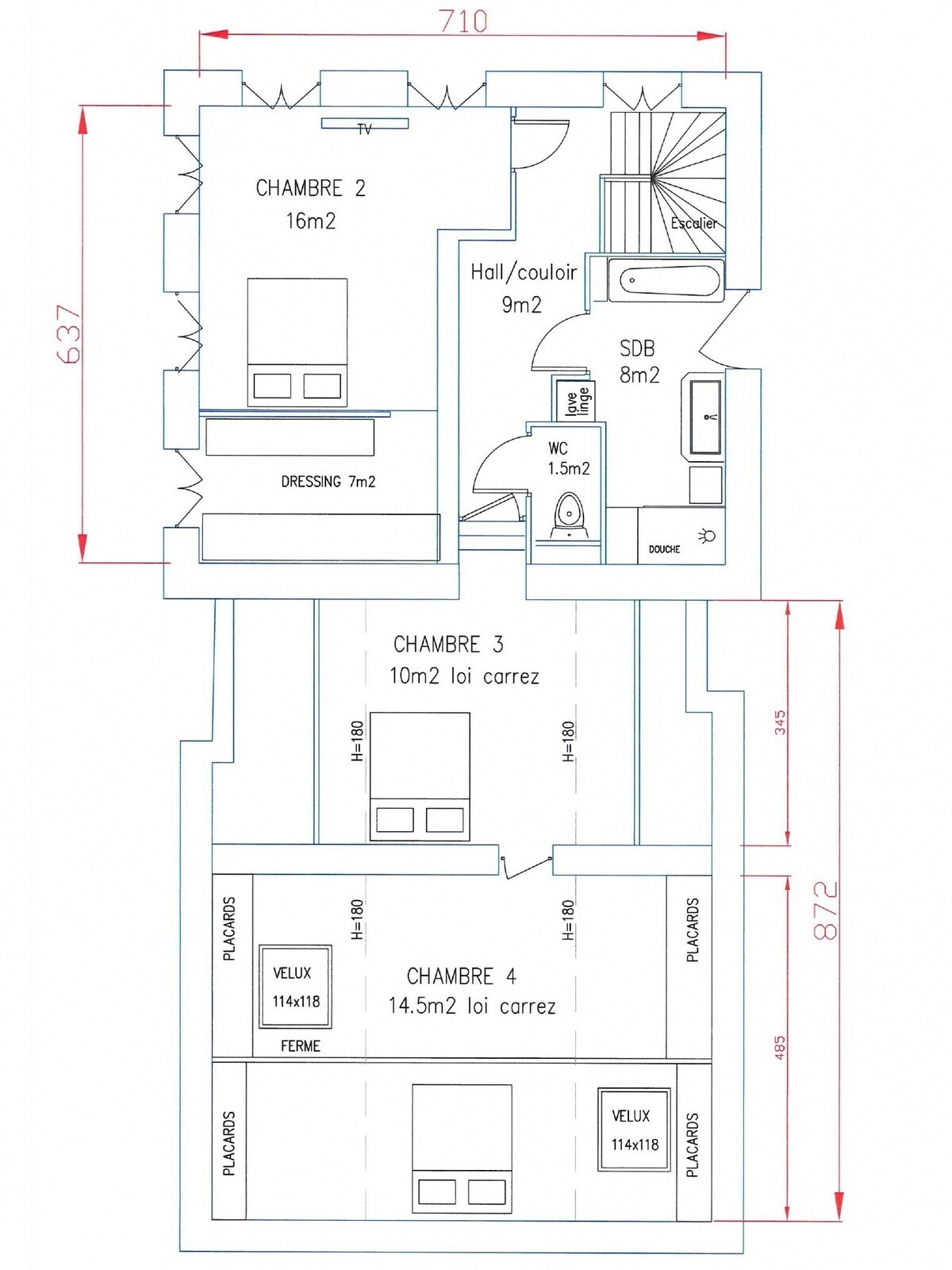 Palier distribuant une chambre (16 m²) et un dressing (7 m²)