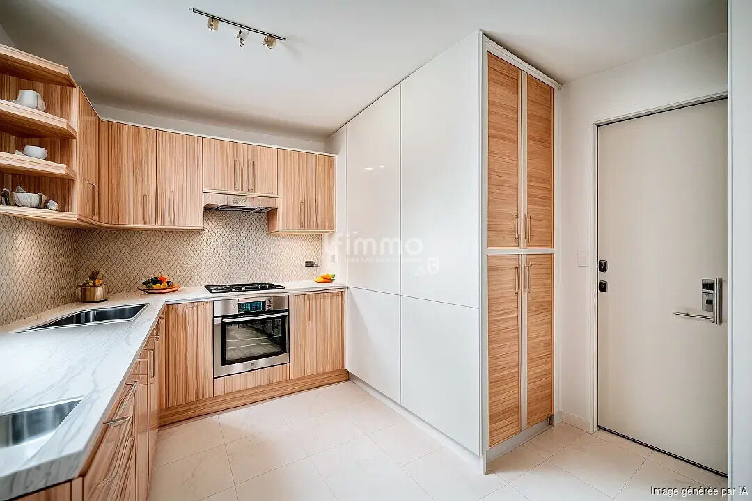 La cuisine attenante, d’une superficie de 7 m², dispose de nombreux rangements et de plusieurs prises, idéale pour cuisiner.