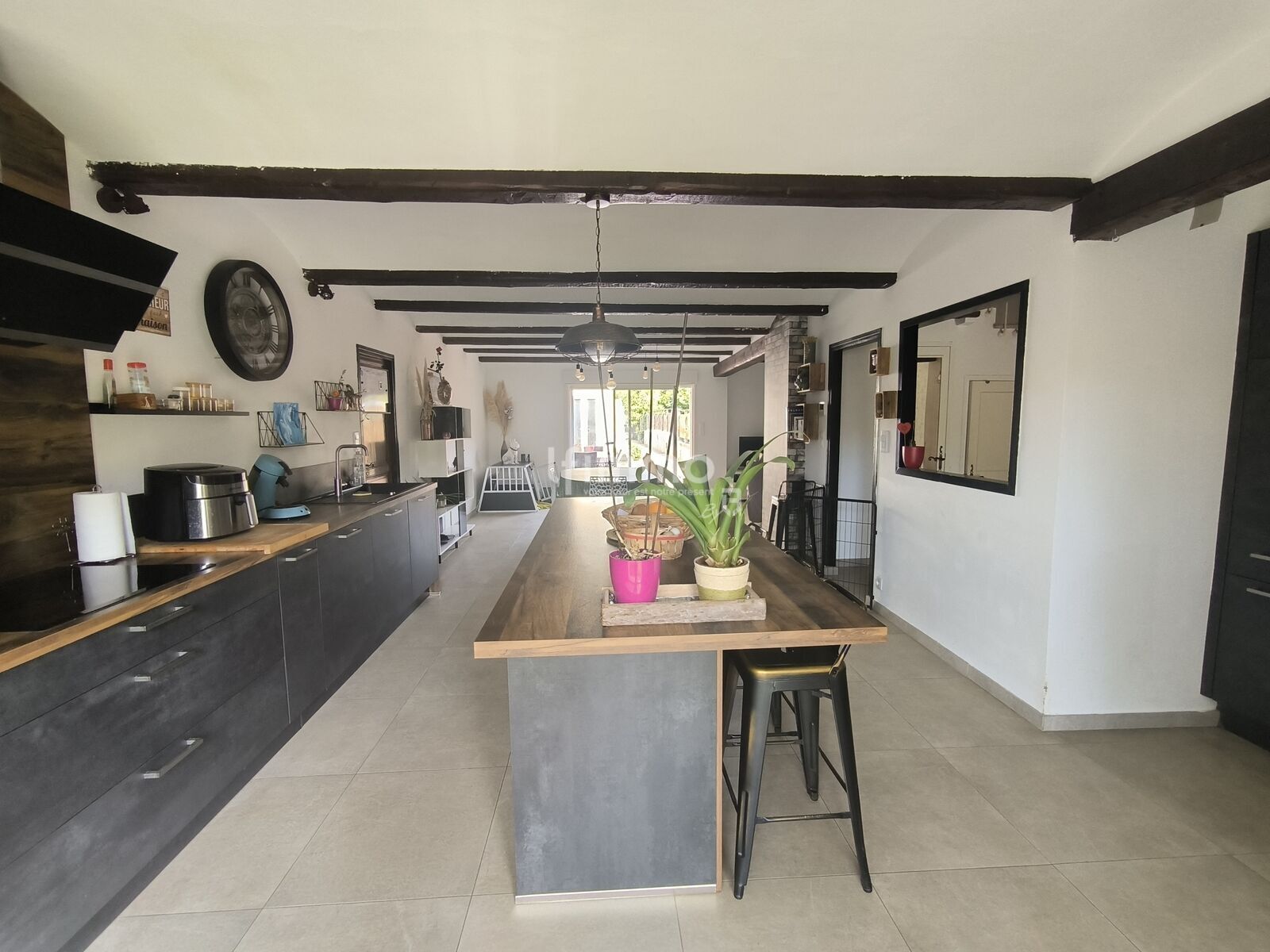 Au rez-de-chaussée, vous découvrirez une entrée, une cuisine équipée ouverte sur la salle à manger / séjour avec cheminée ouverte.